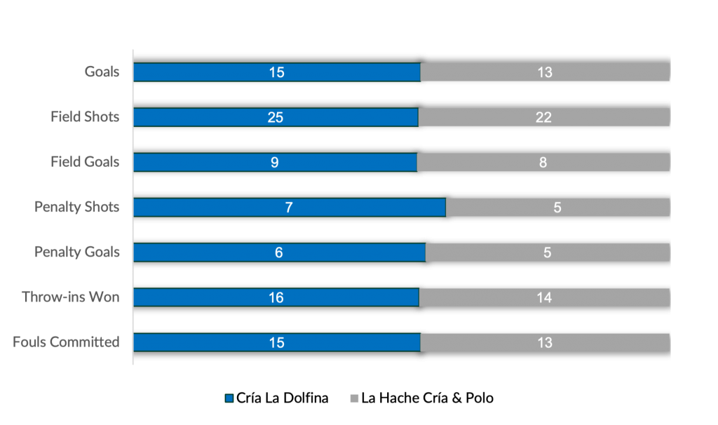 Outshooting their opponents in the field, Cavanagh led Cría La Dolfina’s early offensive push shooting 60% in open play. Each finding success from the line, Cavanagh found the posts three times for Cría La Dolfina, as La Hache Cría & Polo’s Joaquin Pittaluga went 2 for 2. Despite an injury to leading scorer Cavanagh in the fourth, substitute Benjamin Panelo made an immediate impact on back-to-back goals to give Cría La Dolfina a 9-4 advantage at the half.