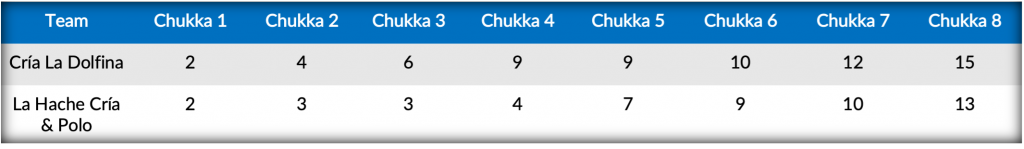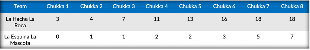 Opening the second half with a four-goal unanswered run, La Hache La Roca was back on the attack, as La Esquina La Mascota relied on their opportunities at the line. Contributing four conversions in the half, Laprida emerged as La Esquina La Mascota’s leading scorer, but the three-more off the mallet of Caset combined with La Hache La Roca’s dominant lead allowed them to take the 18-7 victory with ease.