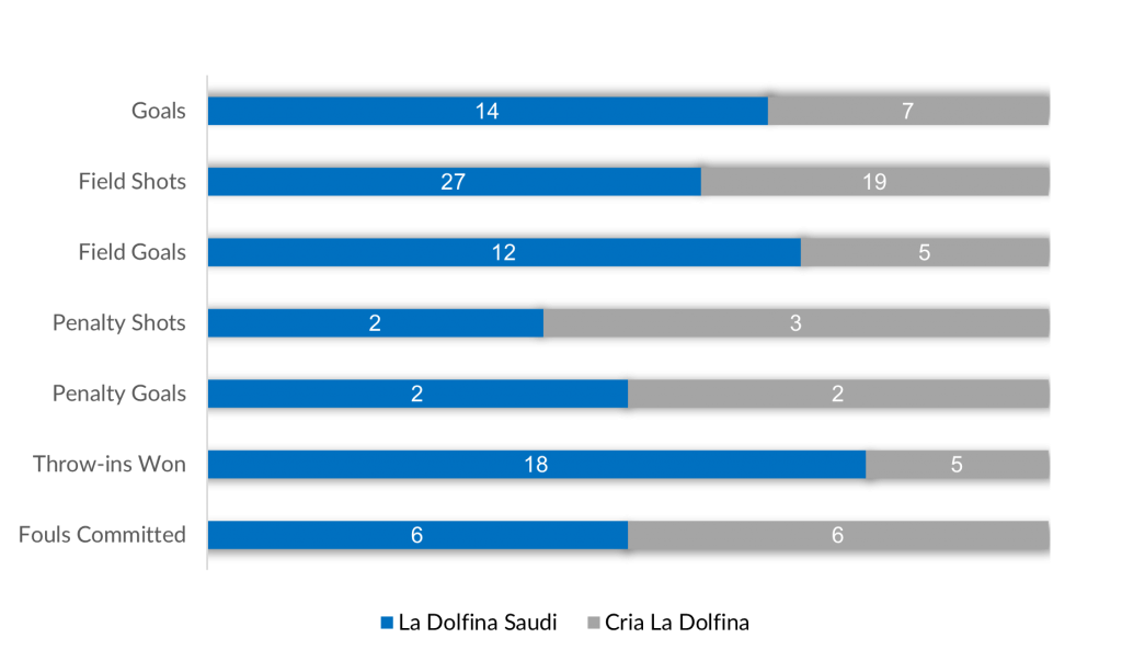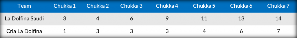 Coming forward from back, Nero led the charge offensively for La Dolfina Saudi, accounting for three of their first four goals in the opening two chukkas, but Cria La Dolfina remained within a single goal with Cavanagh singlehandedly producing three goals of his own, two of which came from the penalty line. The match changed over the third and fourth chukkas with la Dolfina Saudi asserting their dominance on possession, as Stirling scored three unanswered goals from the field, while their defense held Cria La Dolfina scoreless during that stretch to leave the score at 9-3 entering the break.