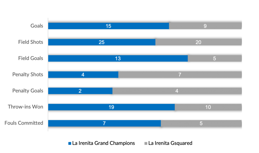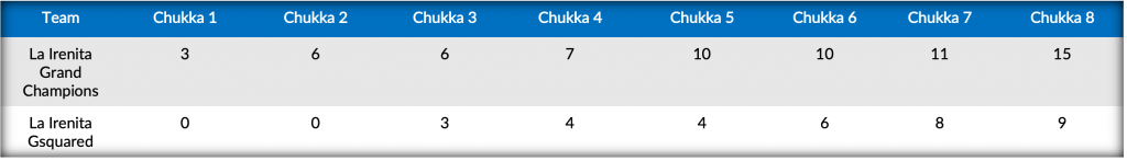 Shutting out La Irenita Gsquared in the fourth, a three-goal effort from La Irenita Grand Champions was answered by Dabas and Podesta for La Irenita Gsquared in the sixth. Trailing by just three, Bocchino broke though from both the field and the penalty line, but a fiery eighth chukka with contributions from Britos and Mac Donough sealed the victory for La Irenita Grand Champions 15-9.