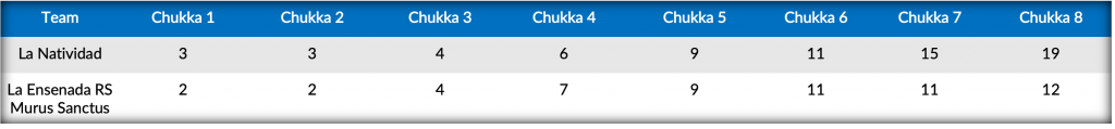 Assembling on Field 1, La Natividad (Camilo Castagnola, Pablo Pieres, Bartolome Castagnola Jr., sub. Alfredo Cappella) met La Ensenada RS Murus Sanctus (Alfredo Bigatti, Guillermo Caset, Facundo Sola, Matias Torres Zavaleta), where La Natividad took advantage of La Ensenada RS Murus Sanctus’ foul troubles to convert ten-goals off the mallet of Castagnola for the 19-12 victory.
