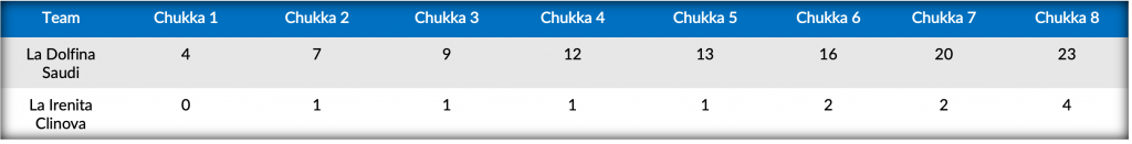 Stringing together another four-goal effort from Poroto and Zacharias to ignite the second half, Facundo F. Llorente provided La Irenita Clinova’s second goal of the contest in the sixth chukka. Converting twice more from the penalty line, Cambiaso was joined by Nero in the field to give La Dolfina Saudi a smothering eighteen-goal lead. Unable to mount sustained pressure and with just twelve shots from the field, La Irenita Clinova’s Bayugar struck twice in eighth, but thirty-three combined shots from La Dolfina Saudi resulting in seventeen off the mallet of Poroto delivered the dominant 23-4 win.
