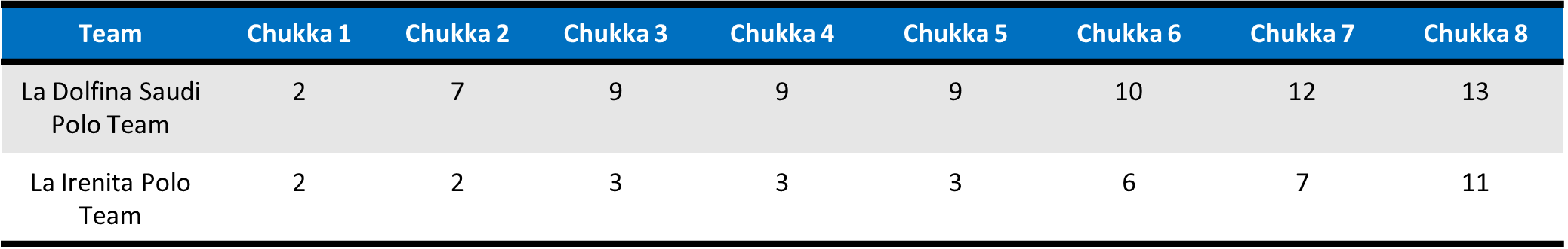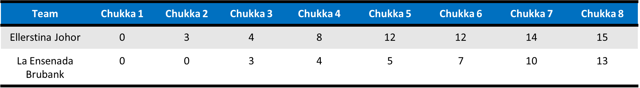 Their rival for so many years, La Dolfina Saudi Polo Team was cheering for an Ellerstina Johor victory to secure their place in the final, while a La Ensenada Brubank victory would mean the improbably result of both Ellerstina Johor and La Dolfina Saudi Polo Team missing the final. However, Ellerstina Johor controlled play over the first five chukkas to hold off multiple charges from La Ensenada Brubank in their comeback attempt. A foul-ridden game resulted in three yellow cards and two technical awarded, but the difference in the game came down to shooting accuracy from the field. Ellerstina Johor shot 45% compared to just 26% for La Ensenada Brubank, to complete their tournament with the 15-13 triumph.