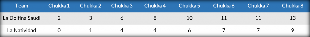 Controlling possession in the opening chukka, La Dolfina Saudi relentlessly pressured the La Natividad defence, collecting two Penalty 2 conversions off the mallet of Poroto Cambiaso. Adding his third goal of the match to begin the second chukka, Cambiaso extended the lead to 3-0 with La Natividad yet to find the goal. Camilo Castagnola scored in the final moments of the second chukka to end the nearly 15-minute drought to begin the match, leaving his team trailing by two. The pace picked up significantly in the third chukka with six goals scored between the two teams. Converting on both of his penalty attempts, Castagnola helped bring La Natividad within one, but Juan Martin Nero came forward from the back on two different occasions to ensure La Dolfina Saudi remained ahead. Finding success with that strategy, Nero continued to press up, as La Natividad struggled to contain the 10-goaler, who added the only two goals of a decisive fourth chukka, that separated the two teams and left La Dolfina Saudi leading 8-4 entering halftime.