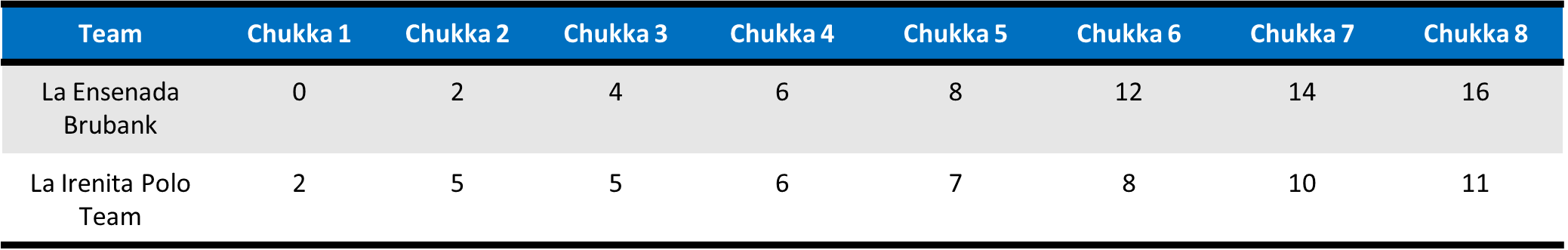 A standout player in the match, Zubia was a significant factor in the opening moments of the second half, adding a field goal and penalty conversion inside the first two minutes to give La Ensenada Brubank their first lead. In the decisive chukka of the game, La Ensenada Brubank exploded for four goals on perfect 2 for 2 shooting from the field and the penalty line to quickly increase their advantage to four and leave La Irenita Polo Team desperate for offense with two chukkas remaining. Foul trouble prohibited La Irenita Polo Team from closing the gap, conceding two penalty conversion to Juan Britos. Despite their best efforts in the final chukka, La Irenita Polo team fell short in the 16-11 defeat.