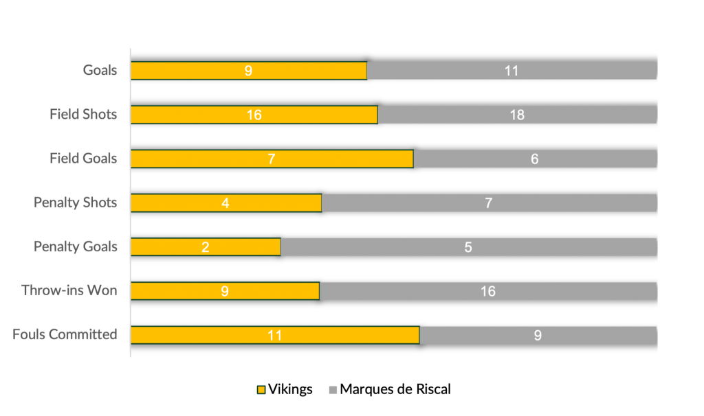 In a closely contested match, both Marques de Riscal and Vikings had their fair share of opportunities. Despite a low shooting percentage of 33% from the field, Marques de Riscal managed to create enough scoring opportunities, converting six goals on seventeen attempts. Their strong defensive play allowed them to launch counterattacks, keeping Vikings largely pinned in their own defensive zone. Combined with a ten-goal contribution from Guillermo Caset, including five from the penalty line, Marques de Riscal ultimately prevailed to capture the two-goal win.