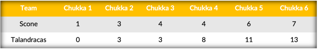 Despite outshooting Scone 14 to 23 in the field, Talandracas’ narrowly managed to emerge on top shooting 44% from the field with their skilled opponents right on their heels at 43%. Controlling the time of possession while displaying 75% accuracy at the line, Talandracas converted four penalty goals on three attempts. Leading Scone with five goals, an impressive performance from Poroto Cambiaso was narrowly bested by a six-goal effort off the mallet of Pablo Pieres to secure Talandracas’ six-goal win.