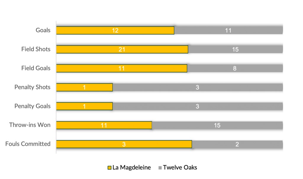 In a thrilling contest, La Magdeleine outshot their opponents from the field, but 48% accuracy in open play compared to Twelve Oaks’ 53% shooting from the field required La Magdeleine to keep the pressure on the opposing goal. Converting 100% of their attempts at the line, Twelve Oaks took the edge on penalty goals, but a balanced offensive approach that relied on turnovers and counterattacks ultimately delivered La Magdeleine the hard-fought one-goal win.