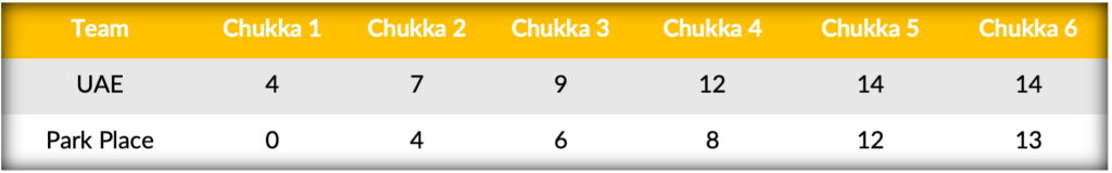 Overcoming their three-goal deficit, UAE opened the second half with Beresford hitting three conversions on three attempts to take a 12-8 edge. Holding UAE to just one shot in open play in the fifth, Park Place’s Pieres once again led the charge for the team in blue to bring Park Place back within two. Despite a final effort from Pieres in the final chukka, UAE was able to stave off Park Place’s comeback bid and secure the nail-biting 14-13 win.