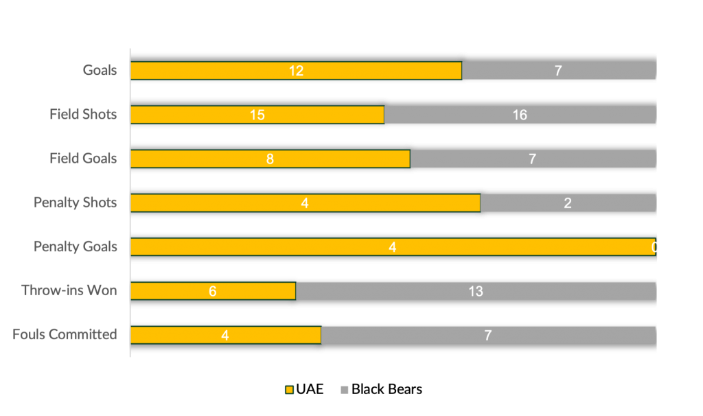 Matching each other in shots from the field, UAE’s accuracy was just enough to overcome Black Bears and hold the advantage in open play. Leading UAE with seven goals, Tomas Beresford proved to be a decisive player in the game, continuing to serve as the heart of UAE’s offensive attack. Despite shooting 44% from the field, Black Bears was often held on defense unable to sustain possession, as UAE captured the five-goal victory.