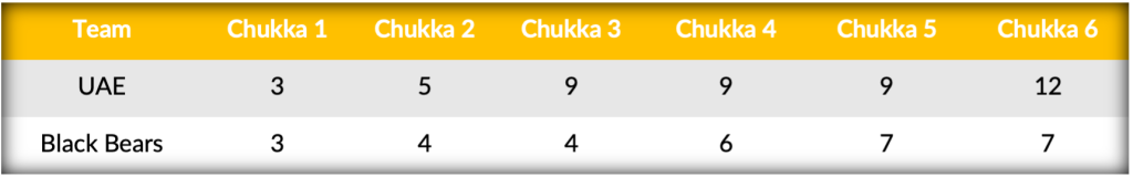 Regrouping at the half, Black Bears came out strong to start the fourth, with back-to-back goals from Schwarzenbach and Nero, pulling their team within three. Continuing their powerful defensive performance, Black Bears held UAE off the scoreboard for a second consecutive chukka, but three-goals off the mallet of Beresford in the sixth halted Black Bears comeback to seal UAE’s 12-7 win.