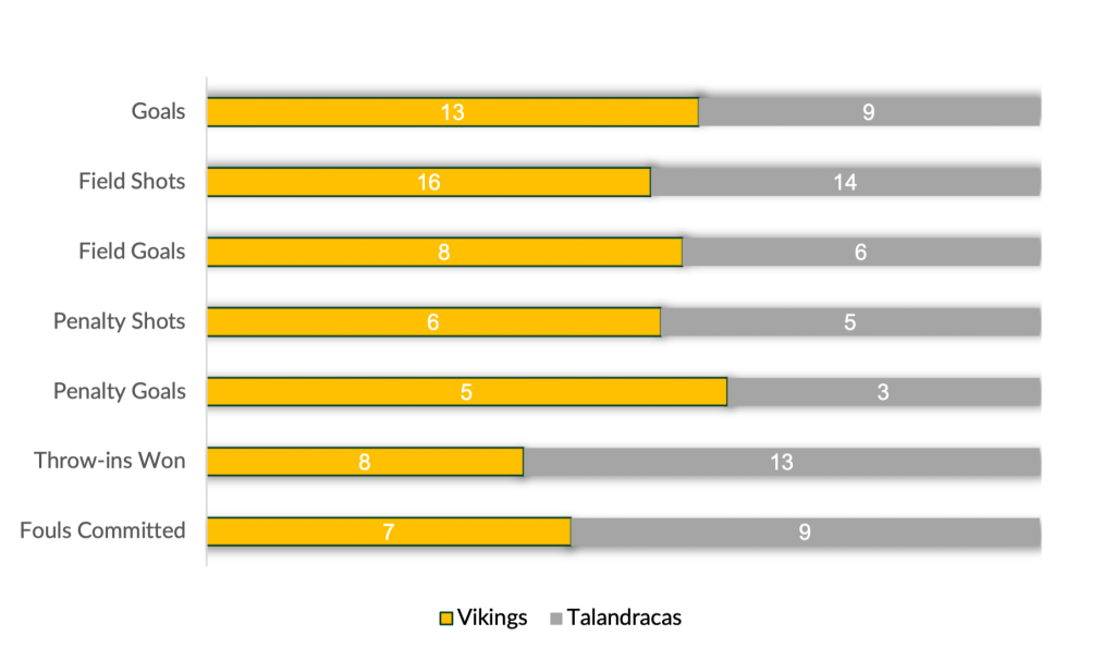 Attacking early, Vikings began the match claiming a 3-1 lead on contributions from Cavanagh and James Beim. Outscoring Vikings in the second, Alejandro Muzzio, Marcos Araya, and Juan Martin Zubia each added their names to the scoreboard to keep Talandracas within striking distance. Trading goals in the third, a strong first half from a Vikings team dialed in on both sides of the ball allowed them to take the 7-6 lead into the tents.