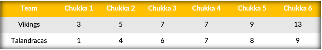 Opening the second half scoring on back-to-back goals, Talandracas briefly held their first lead of the match, but two off the mallet of Cavanagh tied the match 7-all. Carrying their momentum into the sixth, a Vikings scoring blitz produced four-goals in the chukka, including two crucial conversions from Zubia. Holding Talandracas to just one shot in the field and a single goal from Pieres, Vikings’ superior sixth chukka ultimately earned them the impressive 13-9 win.