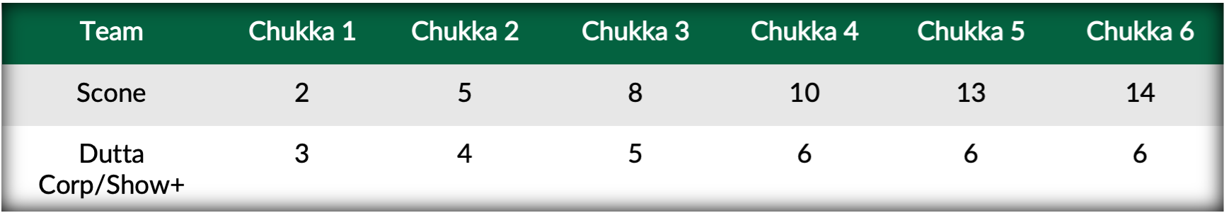 Maintaining pressure to begin the second half, Poroto Cambiaso came out firing, with Magrini following shortly after on his seventh successful penalty conversion. Joaquin Avendano responded for Dutta Corp/Show+ but the momentum had swung heavily towards Scone. Finishing with four consecutive goals, including one from Miki Astrada who substituted for David Paradice, all four Scone teammates found the scoreboard, as they sailed to the 14-6 win.