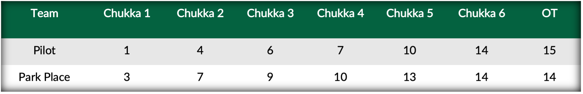Producing an explosive offense in the first half, Park Place built an early lead against Pilot with accurate shooting from the field to lead throughout much of the game, yet an astounding 9 for 9 penalty shooting performance from Pieres allowed Pilot to pull even before the end of regulation. Combining for 13 of Park Place’s 14 goals, Hilario Ulloa and Juan Britos excelled in their two-man attack that would have captured the victory on most occasions, but foul trouble leading to 10 penalty goals for Pilot forced overtime where 10-goaler found the space needed to complete the comeback and propel Pilot to the high-scoring 15-14 win.