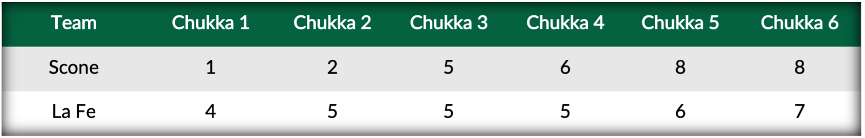 Still adjusting to their injury adversity, La Fe sent Magrini back to the line for the only goal in the fourth chukker. Now wearing the team captain armband for La Fe, Lucas Diaz Alberdi stepped up the second half, scoring a phenomenal goal from the field to tie the game once again. Keeping La Fe on the defensive end of the ball, Adolfo Cambiaso hit the goal for his second of the day, while Magrini scored his fourth, and second from the line to take an 8-6 lead. Ending the game on a positive note, Bilbao finished one last drive for La Fe, but the strength of Scone and the loss of Francisco Elizalde was too much to overcome, as Scone took the 8-7 victory to remain undefeated in bracket play.
