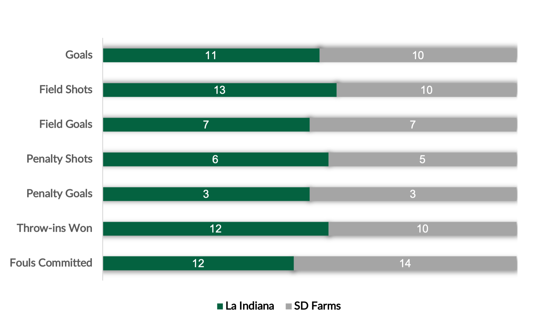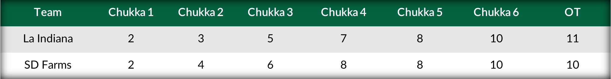 Tied six different times in the game, La Indiana and SD Farms matched each other stride-for-stride throughout the competitive game that was decided by the smallest of margins. Shooting opportunities needed to be earned and each team took advantage of their chances at goal as SD Farms shot 70%, while La Indiana also finished an accurate 54% from the field. Producing three additional shots at goal proved to be the difference for La Indiana, who was led by the seven-goal performance from Criado Jr. His overtime goal moved him into third in scoring behind two 10-goalers and secured the 12-11 victory for La Indiana to remain undefeated entering elimination play.