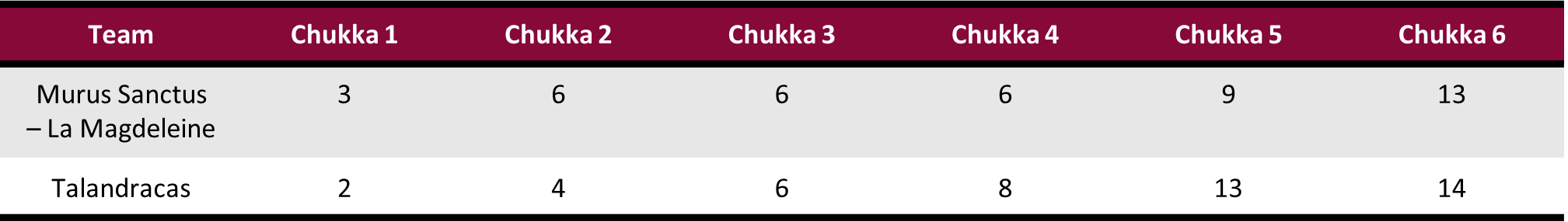 Not a single opportunity was missed in the opening chukka as Murus Sanctus-La Magdeleine took the early 3-2 lead on one goal each from their trio on perfect shooting from the field and penalty line. Unable to produce a shot on goal in the first seven minutes, Talandracas stayed within one goal on two penalty conversions. Once again receiving a goal each from Perry, Sola and Caset, Murus Sanctus-La Magdeleine displayed their balanced attack that gave them the edge on Talandracas but before the end of the half, two more penalty conversions from Castagnola brought the game even at 6-6.