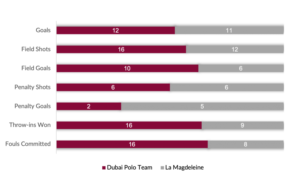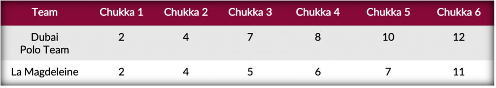 Creating separation in the second half, Castagnola continued his success from the field, adding an additional four goals on just five shots, while an organized defense held La Magdeleine to just two goals from Mac Donough over the fourth and fifth chukkas. Holding a three-goal lead and just one chukka away from victory, Dubai Polo Team faced unrelenting pressure from La Magdeleine, who brought the game back within one on an incredible shot from distance by Mac Donough with one minute remaining. Holding off the comeback attempt, Dubai Polo Team had a successful return to Guards Polo Club, taking their opening match 12-11.