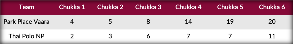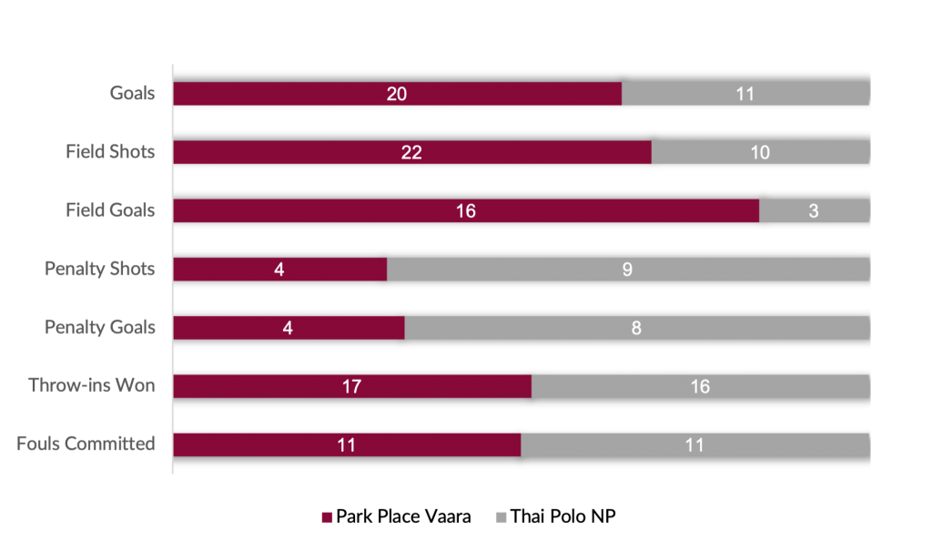 Never trailing in the game, Park Place Vaara surged out of the halftime break with an 11-1 run that was led by perfect 7 for 7 shooting in the game from Ulloa. Despite eight penalty conversions from Ned Hine, Thai Polo NP were unable to slow the electric Park Place Vaara attack as Ulloa finished with a game-high 11 goals to claim the 20-11 victory.