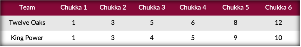 Continuing his strong play from the first half, Laprida opened the second half scoring on a counterattack, with Pittaluga passing the ball forward for the goal. Fighting back into the game with exceptional passing, King Power controlled the fifth chukka on two assisted goals and two penalty conversions to retake the lead and enter the final chukka ahead by one. Trailing by one with two minutes remaining, Charlie Wooldridge made his impact on the match, collecting his second assist of the chukka on a pass to Pittaluga, putting Twelve Oaks ahead to hold off King Power in the final moments and claim their first victory 12-10.
