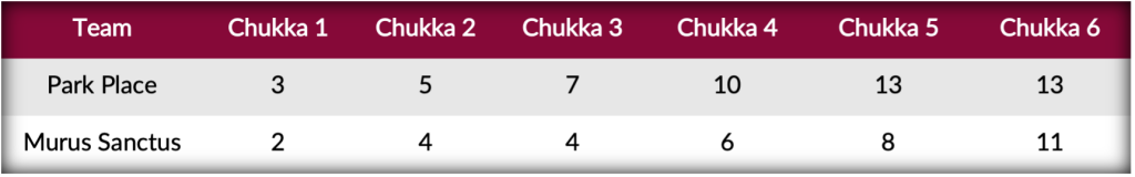 Exchanging penalty goals in the fourth chukka, a second yellow awarded to Alfredo Cappella sent him off for two minutes and allowed Park Place to extend their lead further, holding a commanding 13-8 lead with one chukka remaining. Despite denying their opponents from the scoreboard for the first time in the match, Murus Sanctus’ final effort fell just short and was not enough to overturn a spectacular performance from Pieres in a 13-11 Park Place victory.
