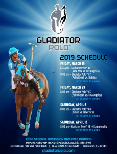 Gladiator Polo™ continues into April with games scheduled on Friday, March 29 featuring Team Palm Beach vs Team Los Angeles, Saturday, April 6 with a match between Team Dublin vs Team New York and conclude with the Gladiator Polo™ Championship on Saturday, April 13 at 8:00 p.m. All games will begin at 8:00 p.m. with gates opening at 7:00 p.m. General admission and parking are FREE.