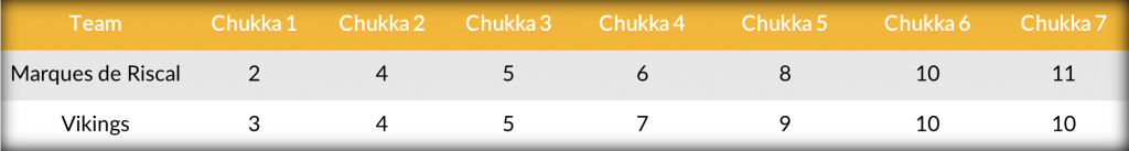Focused on joining Park Place Vaara with a 3-0 record, Marques de Riscal ran into a determined Vikings team to produce an exciting match. Never separated by more than one goal at the end of each chukka, Vikings took the early 3-2 advantage after Penalty 3 and 4 conversions from Juan Martin Zubia. In a near reversal of the opening seven minutes, Marques de Riscal brought the game back to even at 4-4, with Guillermo Caset leading the charge. In a fitting conclusion to the first half, Vikings’ Diego Cavanagh and Marques de Riscal’s Santiago Cernadas traded assisted field goals as the first three chukkas left the teams deadlocked at 5-all.