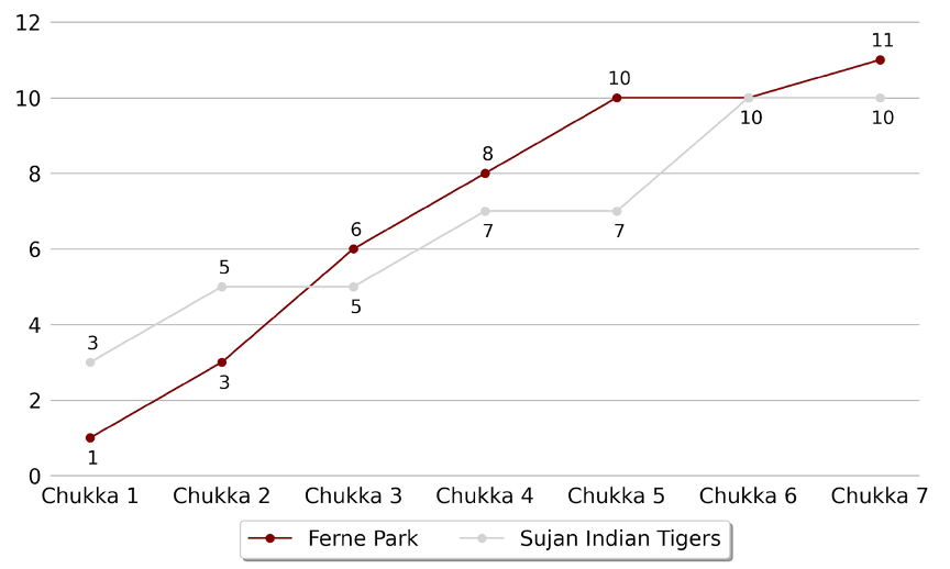 The audience were treated to another extra chukka match in the second game of the day after a thrilling match ended in a final chukka comeback from Sujan Indian Tigers which took everyone by surprise and pushed the match into overtime. Ferne Park played a consistent game, never seeming rattled as they sent home 6 goals from the field and 5 from the penalty line. They did however give away some opportunities to Sujan Indian Tigers who scored 80% of their penalties. 10-7 going into the last it seemed like a done deal for Ferne Park, but a herculean effort from the Tigers saw them score 3 unanswered goals in the last to equalise and push to overtime. Unable to keep the momentum going it was Ferne Park who stole the victory with a golden goal to take their second win of the tournament so far.