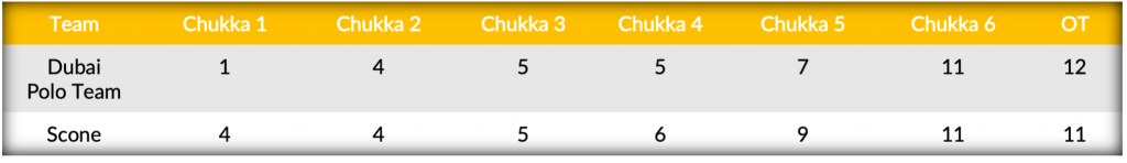With a spot in the final on the line, play tightened to begin the second half and the result was five combined fouls between the two teams. While Scone’s Poroto Cambiaso sent a Penalty 2 through the posts, Dubai Polo Team missed all three of their penalty attempts to trail by one. Del Carril knocked a Penalty 2 in during the fifth chukka to break the drought for Dubai Polo Team, but it would be their only penalty conversion of the match as all remaining goals came from the field. The back-and-forth game had the spectators on the edge of their seats, but it was a three-goal chukka from Scone that suddenly put them ahead by two with just one chukka between them and the final. Moving forward in the game, Nero added his third goal to increase Scone’s lead further, but Dubai Polo Team stormed back with an impressive comeback. Collecting two goals and an assist, Castagnola raised his level of play to stun Scone and tie the game at 11-all and force overtime. Nearly three minutes into the extra chukker, a steal from Perry sprung Castagnola on a breakaway and he carried the ball through the posts to send Dubai Polo Team into the finals with the thrilling 12-11 victory.