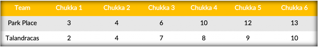 Park Place’s offensive came to life in the second half due to the exceptional play of 10-goaler Facundo Pieres. Displaying a dominant style of play, Pieres sent both shot attempts through the goal, added a Penalty 3 conversion, and assisted on an Elizalde field goal all in the fourth chukka to push Park Place into the lead 10-8.  Held without a field goal for the entire second half, Talandracas needed to produce from the penalty line as Pablo Pieres added his third penalty goal, but the momentum was firmly in Park Place’s favour. Extending their lead to three, Park Place was steps from victory and with an organized defensive effort that prevented a Talandracas run, young Louis Hine scored his first of the match to seal the 13-10 win.