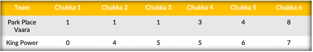 Park Place Vaara’s leading scorer and 10-goaler Hilario Ulloa finally broke free after the halftime break, scoring back-to-back goals followed by an assist to Britos to bring Park Place Vaara back within one. Harpers third goal of the match temporarily halted Park Place Vaara’s offensive onslaught to keep King Power ahead 6-4 but the dominance of Park Place Vaara in the field could no longer be contained. Continuing their goal-scoring blitz, five shots on goal resulted in four finding the posts, with Ulloa and Britos each adding one more, while teammate Santos Merlos joined in the attack to score two of his own. Suddenly trailing by two goals, a pivotal field goal from Harper brought King Power back within striking distance, but as the final horn sounded it would be the explosive second half efforts of Park Place Vaara that completed the comeback for the 8-7 victory to remain undefeated.