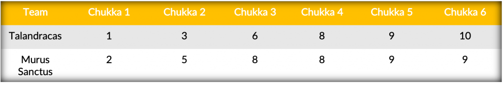 Igniting their second half comeback, Talandracas relied on strong defensive play to hold their opponents off the scoreboard for the first time in the match and received a key goal from Pieres to tie the match at 8-all. Trading goals once more, the two evenly matched teams saw Strada hit his second penalty conversion, while Murus Sanctus’ Sola struck once more from the field for his impressive seventh goal of the match. Going into the final chukka of regulation deadlocked at nine, each team had the opportunity to take the lead but a final stand-up defensive effort from Talandracas held Murus Sanctus scoreless while Talandracas’ leading scorer scored the winning goal on a strike from the field to complete the 10-9 comeback victory.