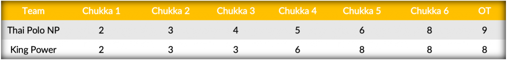 Following the first goal for Jared Zenni in open play to extend Thai Polo NP’s lead to two, King Power took control of the tone on the field. Starting a five-goal unanswered run off the mallet of Weisz, Pieres took advantage of back-to-back conversions, along with James Harper’s first goal of the match to pull ahead 7-5. Briefly halting King Power’s efficient offensive attack on a drive from Podesta, a response from Pieres to convert one of his two attempts in the chukka extended King Power’s advantage 8-6. Following losses to both Great Oaks LL and Marques de Riscal and faced with the possibility of going 0-3, Thai Polo NP assembled a statement sixth chukka. Holding King Power to just one shot in the field, Hine converted his third penalty goal on the day, while Podesta sent the match into overtime with a key conversion from the field. Feeding off their offensive momentum established in the previous chukka, one shot from Zenni was all Thai Polo NP needed to find the posts and claim the hard-fought 9-8 victory.