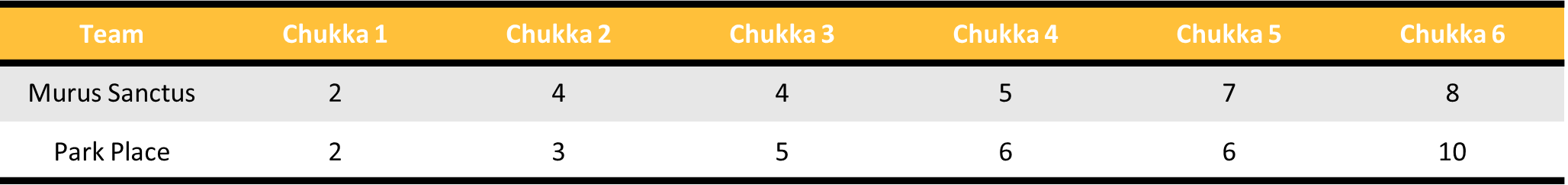 Trading goals over the first seven minutes, Murus Sanctus received field goals from Caset and Facundo Sola, while Park Place responded with a well-balanced team effort that resulted in goals from Pieres and Will Harper, along with an assist from Juan Britos. A fast pace was set on both sides of the ball over the remainder of the half with few fouls and Murus Sanctus pulling ahead on consecutive goals from Caset. However, scoring chances were difficult to come by with each team providing defensive stands as possession continued to switch in the middle of the field. Holding Murus Sanctus without a goal in the third chukka, Park Place took the lead after two Penalty 4 conversions from Pieres left the score at 5-4.