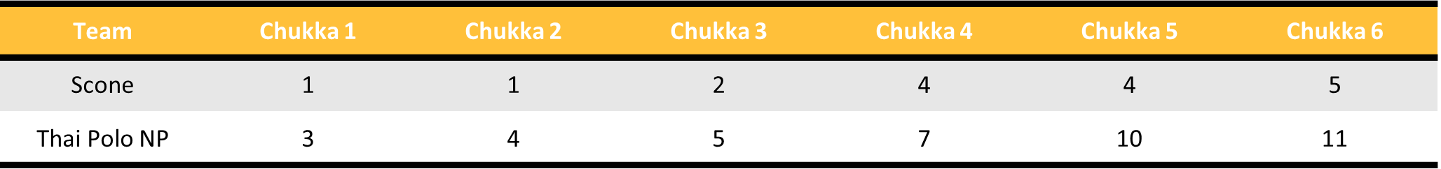 Remaining focused, Thai Polo NP began the second half where they left off, relying on the duo of Pieres and Harper to drive them forward. Pieres sent the ball through the goal posts on a Penalty 2 attempt and then found Harper on the end of the pass to make the score 7-2 against a Scone team that struggled to generate any significant attacks. The only Scone player to score from the field, Poroto Cambiaso added his second goal bringing his team back within three, however the organized Thai Polo NP defense prevented a further run. A dominant fifth chukka sealed the outcome as Thai Polo NP outscored Scone 3-0 on one goal each from Pieres, Harper and Louis Hine, extending the lead to six and leaving little time for Scone to produce a comeback. Trading goals in the final chukka, the six goal difference remained and Thai Polo NP claimed the 11-5 win.