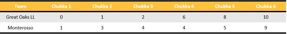 A slow, controlled pace was set over the opening two chukkas as Ignacio Toccalino led Monterosso’s attack. A Penalty 2 conversion provided the only offense in the first chukka with Great Oaks LL unable to convert any of their three attempts at goal. Adding two more goals in the following chukka, Toccalino continued to lead Monterosso on the offensive end, while David Stirling effectively prevented Great Oaks LL from providing a response. The low-scoring first half ended with a Penalty 2 conversion and field goal from Castagnola, but those were the only goals Great Oaks LL could generate, trailing 4-2 entering halftime.