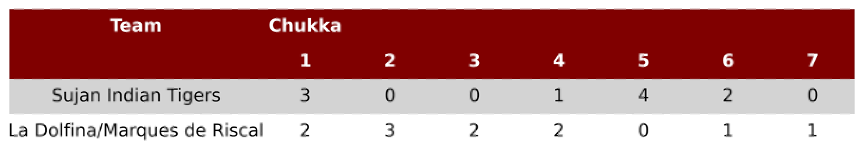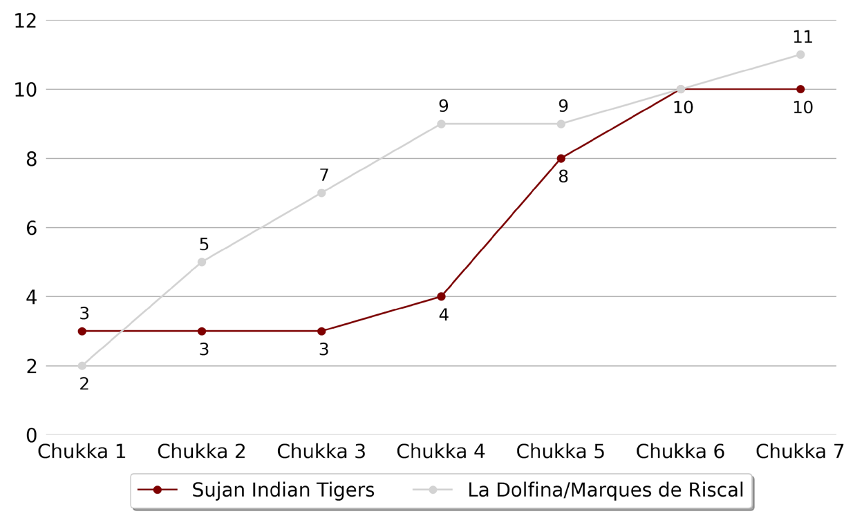 An exciting extra chukka defined the last match of the day between La Dolfina/ Marques de Riscal and Sujan Indian Tigers. This is the 3rd win for the La Dolfina/ Marques de Riscal team who were beaten by Kazak in their last match and so this was a vital win for them to smooth their path to the quarters while Sujan Indian Tigers now have 2 wins and 2 losses and their place is not guaranteed. Such an important result made for some thrilling polo with both teams going in hard. It was La Dolfina/ Marques de Riscal leading from chukka 2, reaching an impressive 5 goal lead by the end of the 4th chukka but that’s when Sujan Indian Tigers switched it on. 4 goals in the penultimate plus 2 to equalise in the final chukka pushed the game to overtime, but despite the impressive comeback and the equal possession throughout it was La Dolfina/ Marques de Riscal who were able to clinch that all important win, scoring the golden goal to win 11-10.