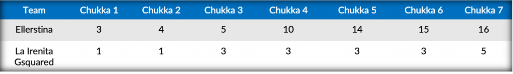 Maintaining offensive pressure, three more goals off the mallet of Facundo was capped off with a successful drive from Gonzalo Pieres to increase their advantage to eleven. Shutting out La Irenita Gsquared for the third straight chukka, Hilario Ulloa continued to add to Ellerstina’s lead. Finally finding the goal in the seventh chukka after struggling to convert from the field, back-to-back goals from Dabas wasn’t enough to over the offensive firepower of their opponents, as Ellerstina sailed to the 16-5 victory.