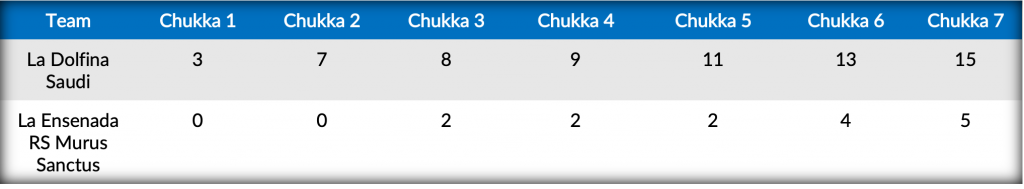 Opening the second half, the Cambiaso’s connected for back-to-back goals to increase La Dolfina Saudi’s lead to nine. Still searching for their first field goal of the match, Nero finally connected for La Ensenada RS Murus Sanctus, as Sola and Carril added another two. Despite adding an additional goal from Sola, La Ensenada RS Murus were never able to find an offensive rhythm, as two-more goals from David Sterling and Poroto Cambiaso capped off La Dolfina Saudi’s dominant 15-5 win.