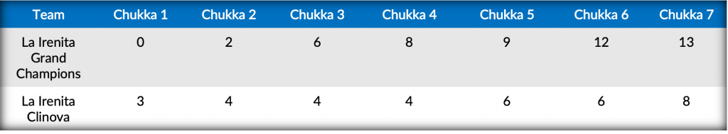 Trading goals in the fifth chukka, La Irenita Clinova’s foul troubles persisted, giving Britos and Zubia the opportunity to convert from the line and maintain a three-goal lead. Scoring seven penalty goals for La Irenita Grand Champions’ Britos connected for the first time on the field for back-to-back goals. Trailing by six to open the final chukka of regulation, goals from Bayugar and Tomas F. Llorente were unable to bring their team back into contention, as thirteen total fouls committed by La Irenita Clinova allowed La Irenita Grand Champions to control play at the line and take the match 13-8.