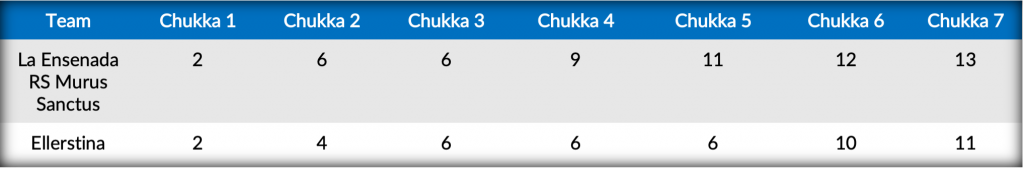 Capping off the doubleheader, Ellerstina (Facundo Pieres, Hilario Ulloa, Gonzalo Pieres, Nicolas Pieres) faced La Ensenada RS Murus Sanctus (Facundo Sola, Alfredo Bigatti, Guillermo Caset, Jeronimo de Carril), as La Ensenada RS Murus Sanctus’ shutdown defensive efforts coupled with eight goals off the mallet of Caset handed Ellerstina their first loss of the tournament in the contested 13-11 win.