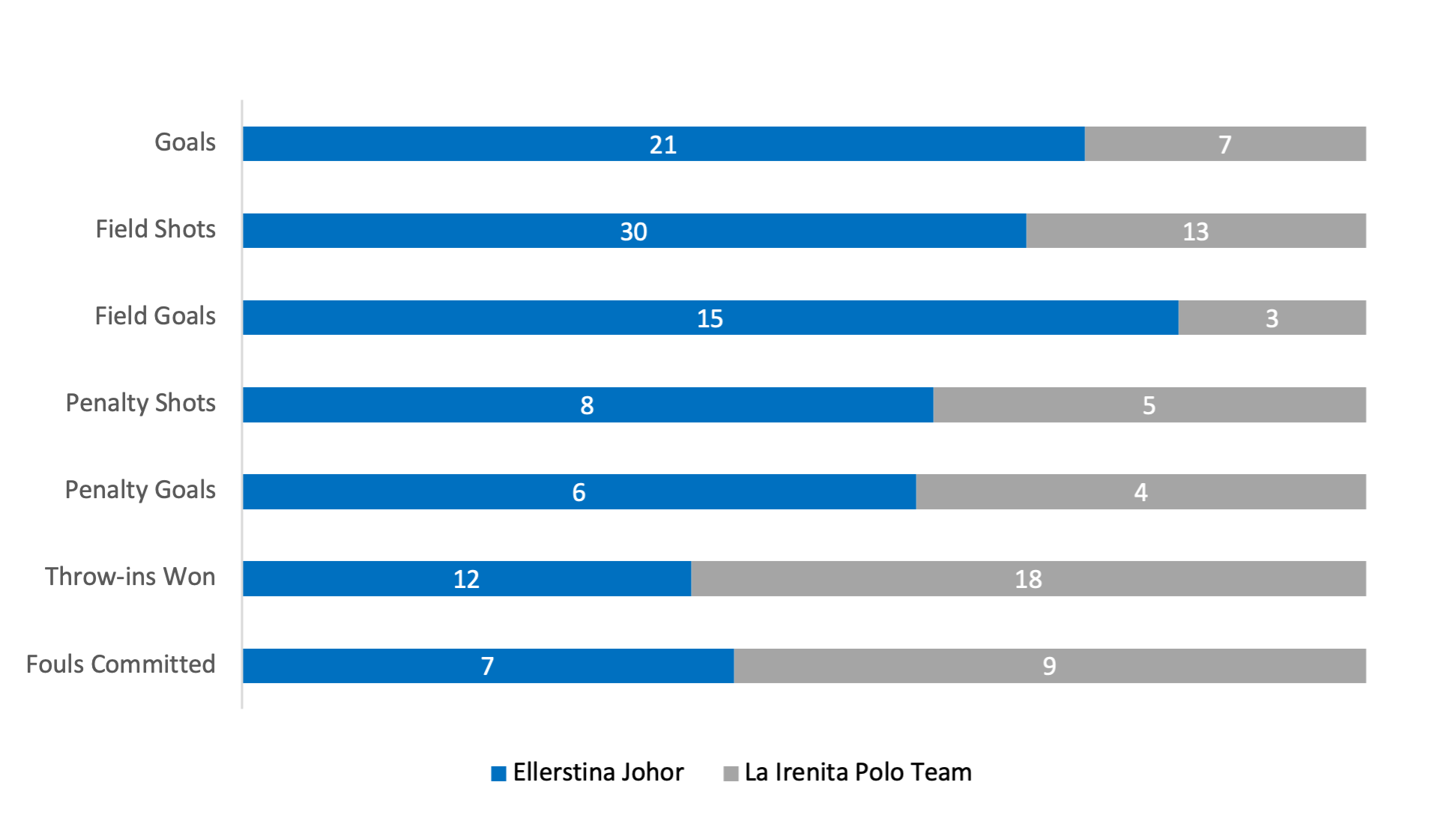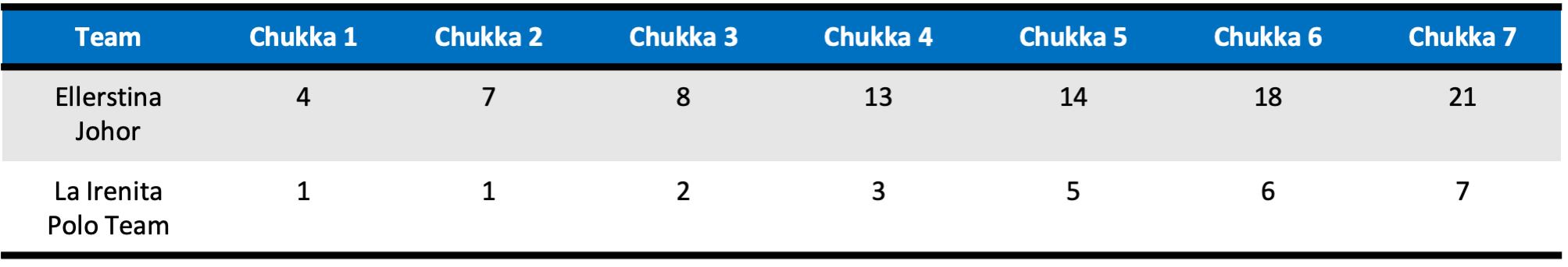 Asserting their strength from the opening of the match Facundo Pieres would reach the scoreboard three times in the first chukka for Ellerstina Johor. A perfect 3-3 on penalty shots, Pieres would also provide an opening assist to brother Gonzalo. Scoring one goal from Ignacio Toccalino in the first, La Irenita Polo Team were unable to repeat in the second chukka as confident play from brothers Facundo and Nicolás Pieres united to contribute three goals for Ellerstina Johor. Early in the third Santiago Loza would strike first for La Irenita Polo Team, but was quickly answered by Gonzalo Pieres, striking again from the field. Ellerstina Johor carried all the momentum into the half, adding an additional five goals in the fourth off the mallets of Nicolás and Facundo to take a commanding 13-3 lead into the break.