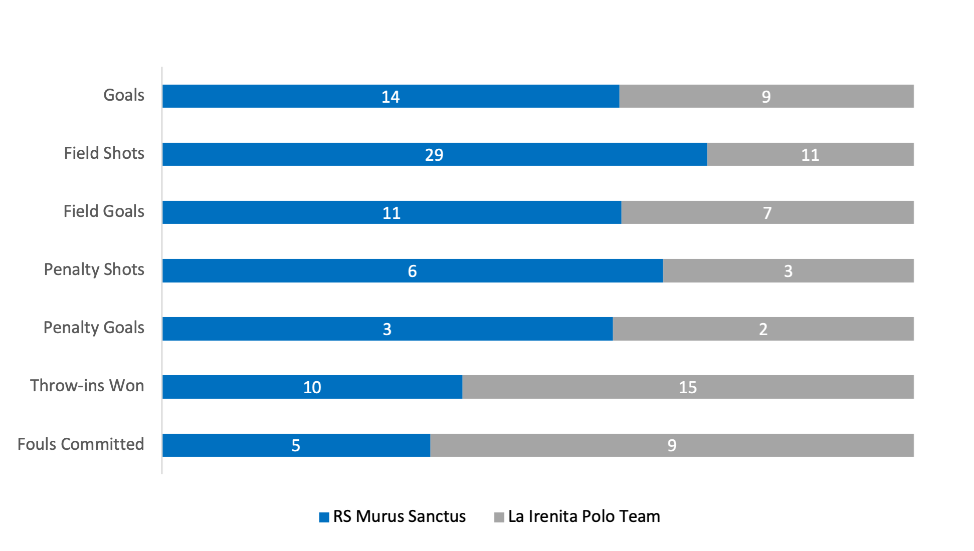 Leading from start to finish in the opening match, RS Murus Sanctus produced a strong showing that was led by the duo of Caset and Nero. Combining for an impressive eight assists, the duo highlighted an effective passing attack that resulted in RS Murus Sanctus heavily outshooting La Irenita Polo Team 29-11. Often on the receiving end of passes, Sola excelled at the front of the match, tying Caset with four field goals to lead all players. Although RS Murus Sanctus struggled with accuracy from both the field and the penalty line, the additional scoring chances led them to victory.