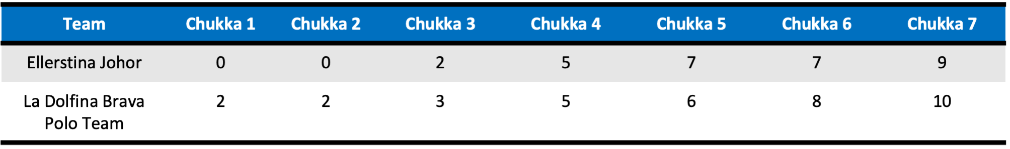 Facundo Pieres opened the scoring in the second half to give Ellerstina Johor their first lead of the game, but it was short-lived as Cambiaso received a pass from Terrera to restore the tie. Cambiaso continued to be a driving force for La Dolfina Brava Polo Team, adding a Penalty 2 conversion and field goal in the sixth chukka to leave his team ahead by one at the beginning of the seventh chukka. Drawing on their experience, Ellerstina Johor raced into the lead, scoring back-to-back goals from Facundo Pieres and Bayugar. With time ticking down, La Dolfina Brava returned to generating goals from the penalty line to tie the score. On the final play of the game it was Terrera who played the hero, scoring the game-winning goal to complete the upset and secure the 10-9 victory for La Dolfina Brava Polo Team.
