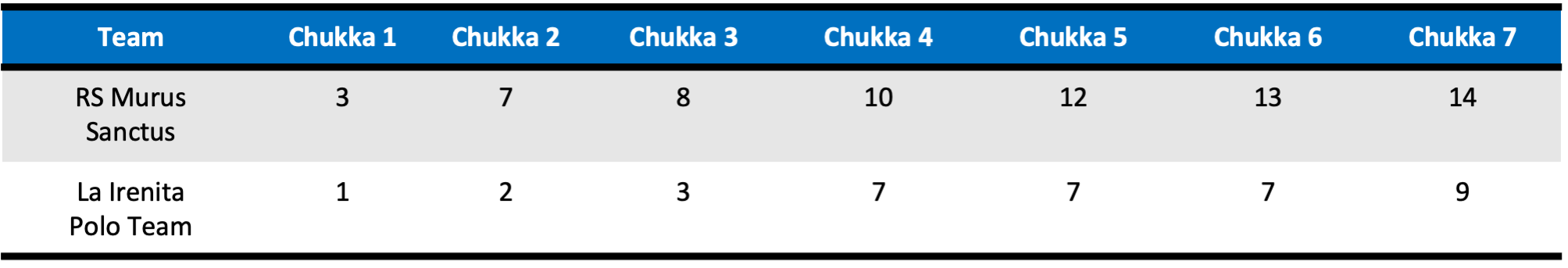 Applying pressure early in the game, RS Murus Sanctus took the 3-1 advantage on two field goals from Caset and one from Sola. Controlling possession, RS Murus Sanctus limited La Irenita Polo Team to just one shot through the opening two chukkas, allowing them to extend their lead further. Assisting on all three of their field goals in the second chukka, RS Murus Sanctus surged further ahead, receiving contributions from all four players, including a field goal from Facundo Fernandez Llorente, playing in place of the injured Pablo MacDonough. The five-goal difference carried through the third chukka until La Irenita Polo Team made a push before the end of the half, scoring four goals in a dominant fourth chukka. Receiving one goal each from all four players, La Irenita pulled within three, trailing 10-7.