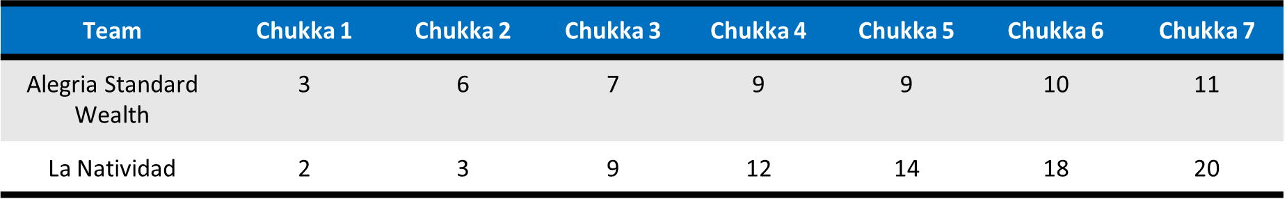 Finding their stride, La Natividad removed any doubt of the outcome at the beginning of the second half, scoring six unanswered goals, three off the mallet of Polito Pieres to turn a three-goal advantage to nine. Unable to hold significant possession in the attacking half, Alegria Standard Wealth finally ended their scoring drought in the final seconds of the sixth chukka on a field goal from Merlos, but it was not enough to keep pace with La Natividad. Completing their impressive second half, Bartolome Castagnola added two goals in the final chukka to secure the 20-11 victory and keep La Natividad undefeated.