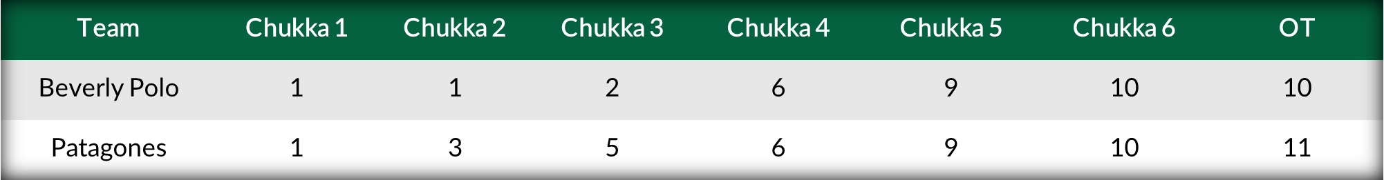 The pace increased after the stop and start first half resulting in thrilling polo and end-to-end action, yet the two teams remained tied with little room for error over the final two chukkers. Ocampo Jr. added two penalty conversions while Patagones excelled from the field, receiving one goal each from Joaquin Avendano, Garcia del Rio and Wulff leaving just seven minutes left to determine the champion. Ocampo Jr. struck first to give Beverly Polo the slim 10-9 advantage, but it was short-lived as Garcia del Rio added his seventh goal on the following play. In a crucial moment, a second yellow card sent Benjamin Avendano off the field for two minutes, but the Patagones defence stood tall, preventing a Beverly Polo goal, and sending the game into overtime.