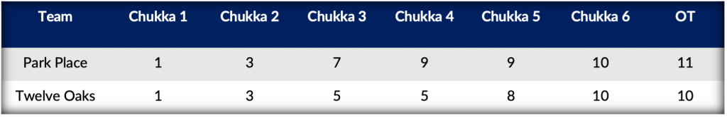 Trading goals to open the match, a five-goal effort from Pieres, including three at the line gave Park Place a 7-5 advantage at the break. Despite entering the second half with the lead, Park Place struggled to find the goal from the field, but goals from Perry and Harper began to turn the tide for Park Place in open play. Following a shutout chukka from Park Place in the fourth, it was Twelve Oaks’ turn to lock down on defense and add three unanswered on contributions from Laprida, Woolridge and Pittaluga. Trailing by one entering the final chukka of regulation, Twelve Oaks’ Woolridge quickly tied the match 10-all. Responding with his sixth goal of the match, Pieres put Park Place back in front, but a final conversion from Pittaluga sent the match into overtime. Controlling the offense in the extra frame, a shot from Harper missed the goal, but 10-goaler Pieres stepped up to the line on a safety attempt to sink the game winning goal and take the contested match 11-10 in favor of Park Place.