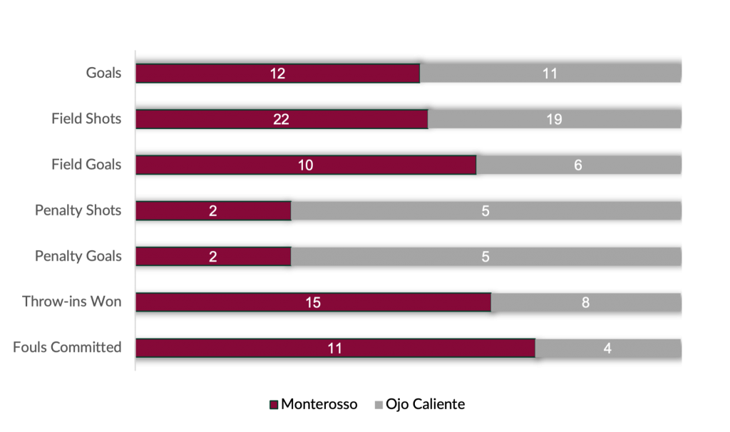 Edging their talented opponents in open play, Monterosso’s 46% shooting gave them the clear advantage in the field, but Ojo Caliente utilized their accuracy from the line to send five conversions through the goal to keep them in contention. Ultimately, Monterosso’s ability to overpower Ojo Caliente from the field combined with a phenomenal finish lifted them to the narrow one goal triumph.